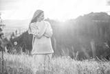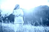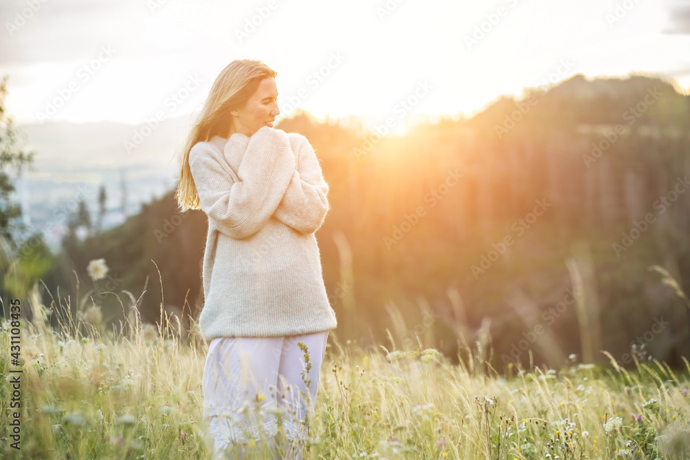 Happy woman enjoying sunset stay on the green grass on the forest peak of mountain. Fresh air, Travel, Summer, Holidays. Health care, authenticity, sense of balance and calmness.