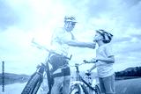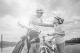 Father teaching son to ride bicycle. Happy cute boy in helmet learn to riding a bike in park on green meadow in summer day at sunset time. Family weekend. 4K video Slow motion
