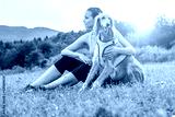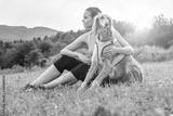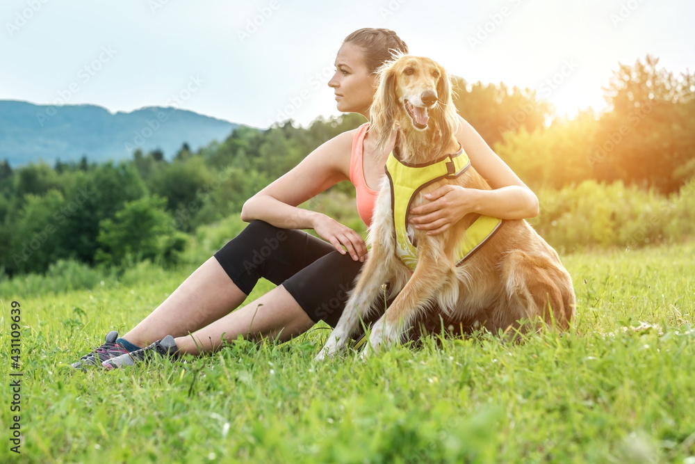 Woman runner and dog on field under golden sunset sky in evening time. Outdoor running. Athletic young man with his dog are running in nature.