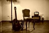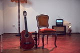Acoustic guitar with retro vintage furniture at home.