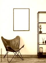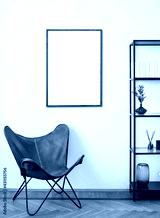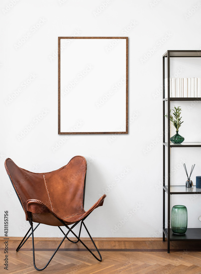 Blank picture frame mockup in interior design. Living room, chair with bookcase. View of modern rustic style interior with artwork template on a white wall. Home design concept