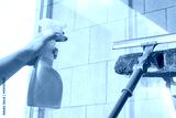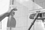 Girl Cleaning open Window of balcony by spraying Cleaning Products and wiping with mop Sponge at the summer sunset evening.
