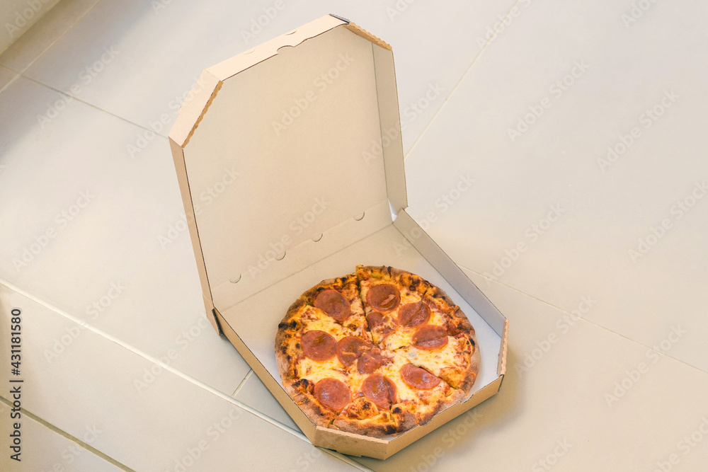 Open box of pizza on home doorstep on front porch. Delivery. Concept