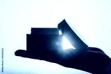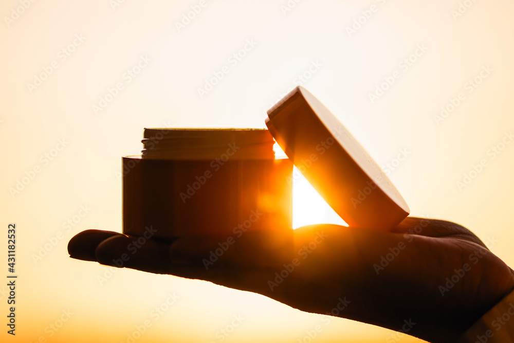 woman applying night hand cream in a jar standing near window at the evening on the sunset background. Concept.