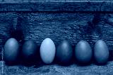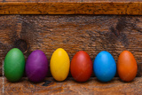 Easter eggs on wooden background. Different color Easter eggs in a row