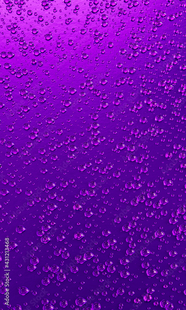 A lot of water droplets On metal or metalic surfaces in pink and purple shades for mobile background or wallpaper. 3D Rendering.