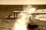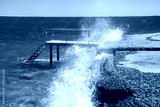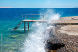 Beautiful seascape of the Egyptian coast, Red Sea, waves breaking into splashes on the pier, bridge for boarding and disembarking passengers.