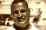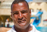 Portrait of a smiling Egyptian man 40 years old in a white T-shirt on the background of the resort landscape, close-up.