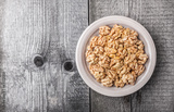 Walnuts in peel ready to eat kitchen table arrangement on gray plate overhead with copy space studio shot