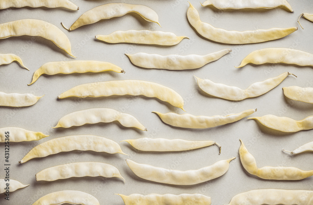 Yellow french beans stacked overhead fresh stacked arrangement on gray background studio shot