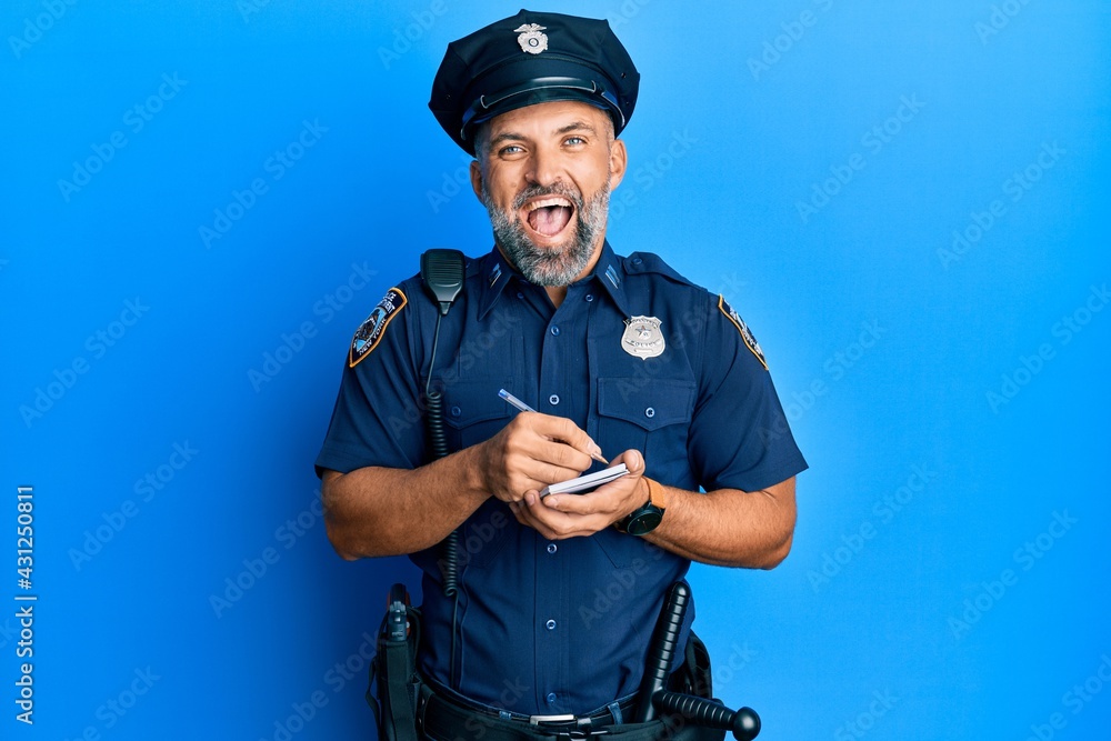 Middle age handsome man wearing police uniform writing traffic fine celebrating crazy and amazed for success with open eyes screaming excited.