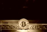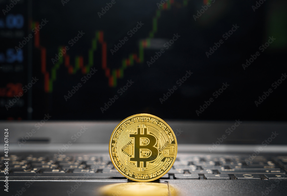 Bitcoin coin on keyboard compute with market price chart
