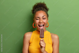 People unhealthy junk food and summer time concept. Cheerful dark skinned woman winks eye eats delicious chocolate ice cream has fun wears casual bright clothes isolated over green background