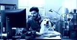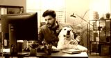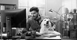 Portrait of joyful Hindu handsome man sitting in cabinet at work with his cute dog pet in good mood typing on computer browsing online. Positive emotions, pet concept. Work in office