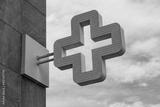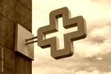 Pharmacy cross in the background against the sky with clouds.