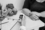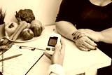 Measuring blood sugar. Nutritionist using glucometer tests overweight woman's blood sugar, prevention control of diabetes
