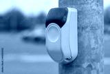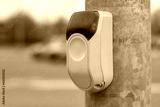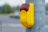 Yellow button at a traffic light for pedestrians on the background of a road with cars.