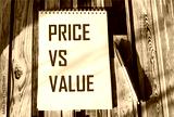 text PRICE VS VALUE on a notebook, near a pen on a striped background. Business concept.