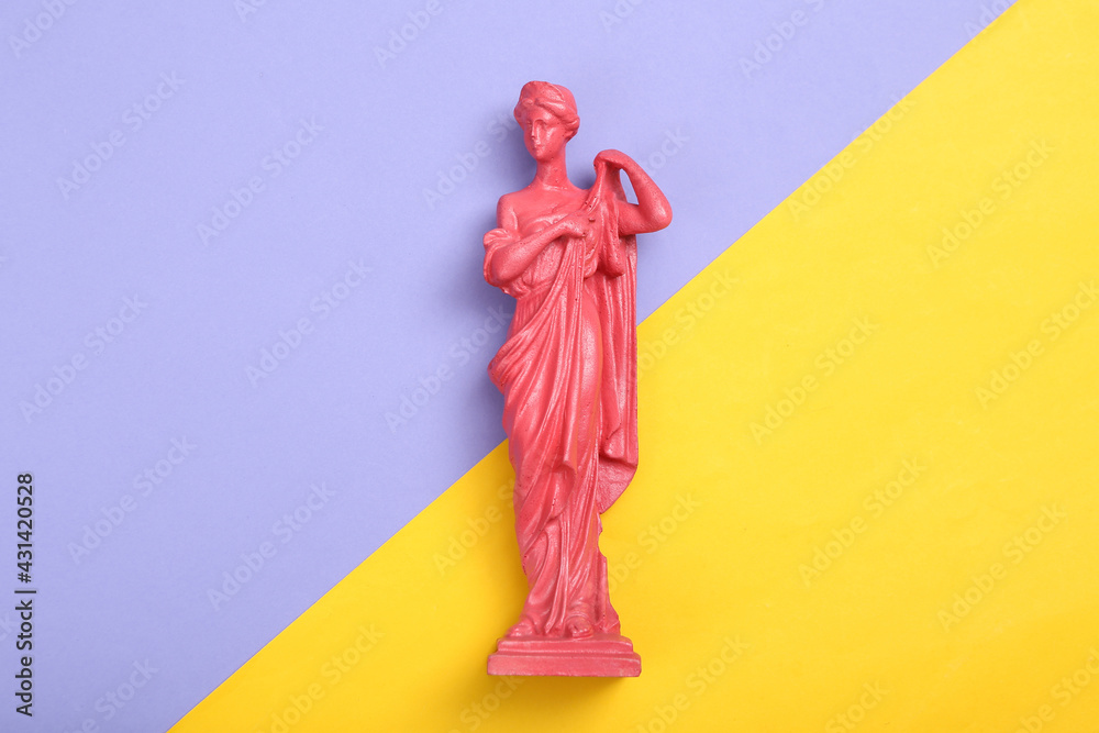 Creative layout. Pink Antique greek goddess statue on purple yellow background. Flat lay. Top view