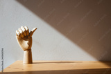 A hand of wood doll make fingers to touch on wooden table, direct, move on gray brown background at the studio with dark shadows copy space