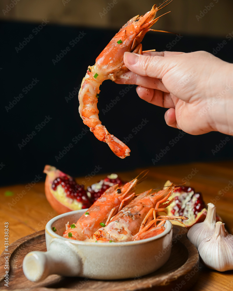 Cooked shrimps served in a white bowl on a wood plate with garlic onion and chili. Sea food.