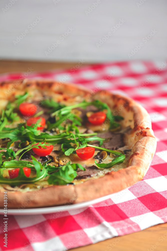 Prosciutto and Arugula Pizza with cherry tomatoes served on a white plate over red plaid table cloth.