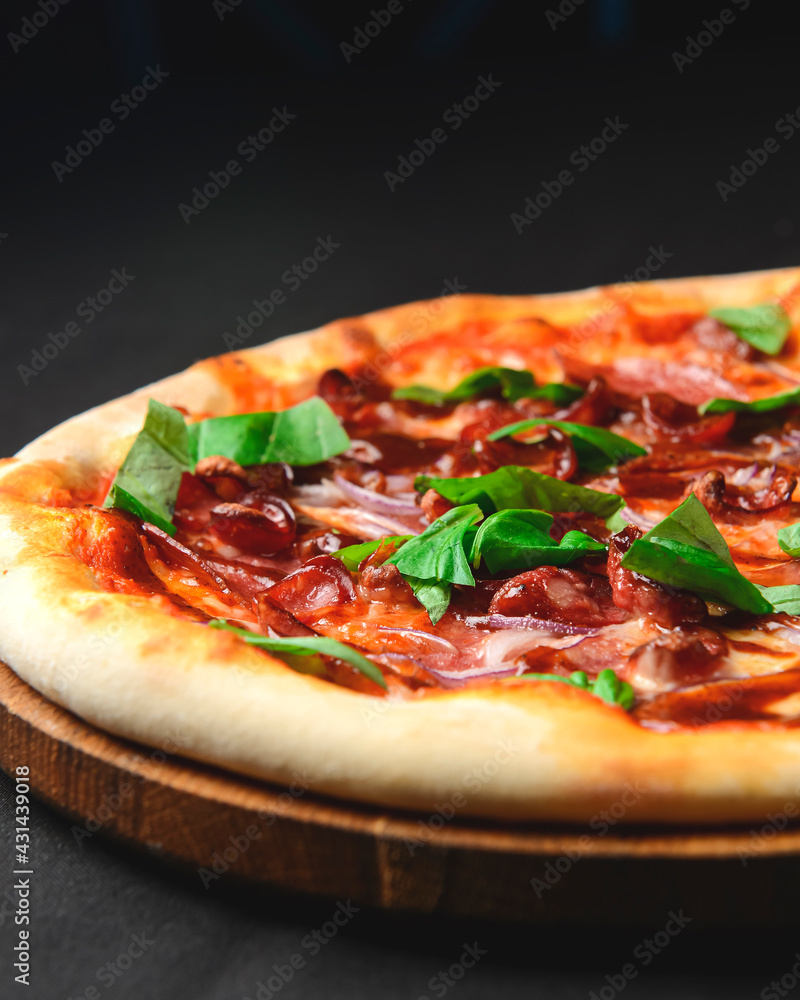 Fresh tasty pizza on black background. Traditional Italian pizza with grilled sausages and arugula over black.