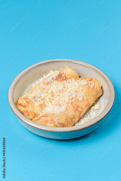 Stack of pancakes with salted salmon and cream cheese Philadelphia in a bowl. Over pastel blue background.