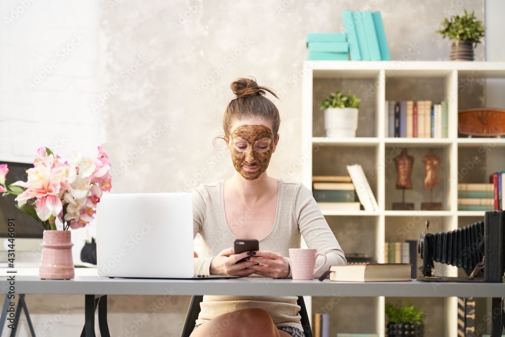 Woman cosmetic facial skin care. Woman in skin rubber peeling face beauty mask sitting at desk using phone and laptop in home office.