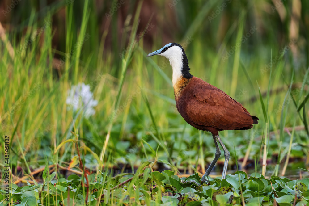 African Jacana - Actophilornis africanus, beautiful colored shy water bird from African lakes, swamps and marshes, lake Ziway, Ethiopia.