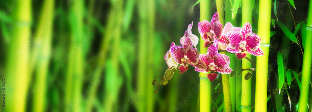 rosa wilde orchidee im grünen bambuswald, natur hintergrund banner tapete