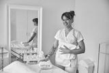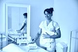 beautiful happy caucasian female masseur is posing in white minimalistic modern treatment salon