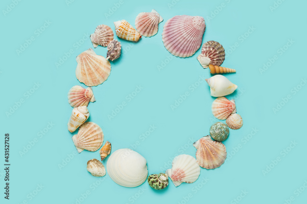 Colorful marine seashells. Summer concept with seashells. Сircle of seashells with copy space in center, blue background.