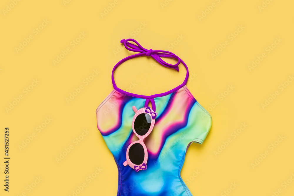 Summer travel holiday vacation background flat lay. Pink sunglasses and towel, colorful swimsuit, starfish and seashells on yellow background.