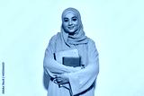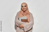 Happy young arabic business woman in hijab with notepad