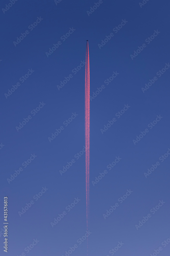 plane in the blue sky at sunrise - behind the plane a red streak of water vapor