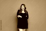 Young plus size caucasian model woman in black gown folded hands and posing over pink background, isolated with copy space
