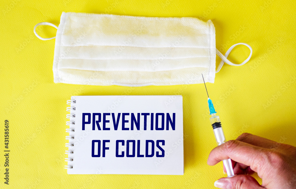Flu prevention concept. Medical face mask on a yellow background and a notebook with the text prevention of colds