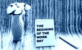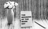 the text THE BEGINNING OF THE WORK DAY is written on a notebook, next to a bouquet of flowers on a wooden background.