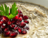 Traditional Middle Eastern food. Lebanese food. Arabian Baba Ghanoush with Pomegranate seeds. Macro, close up
