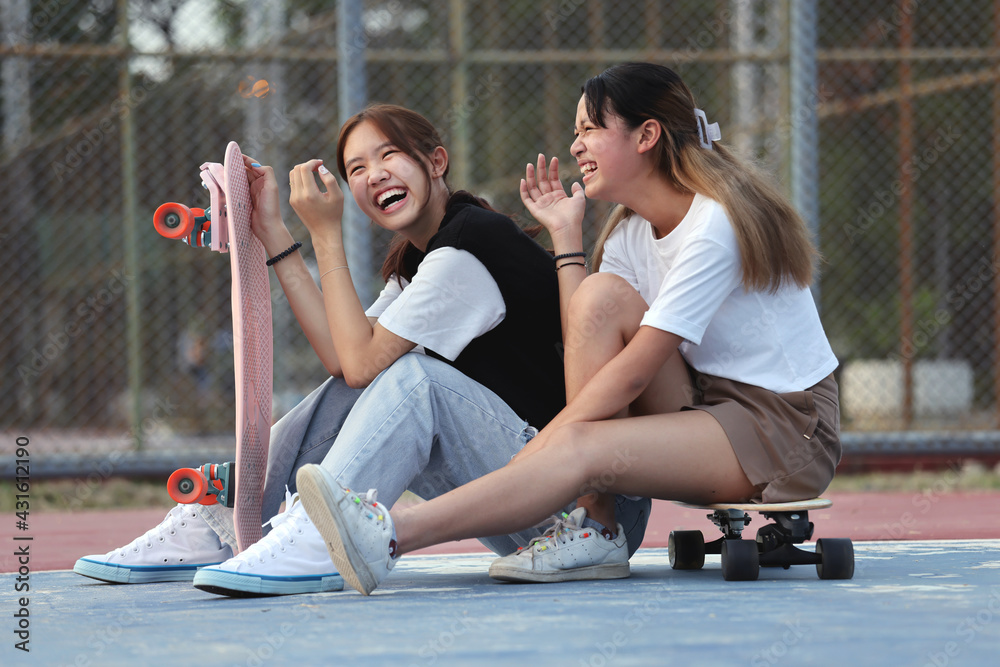 Happy Two Asian Girls Teenage Friends With Skateboard In Sunshine. Playing Together On Summer Day and Skateboarding Lifestyle.
