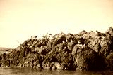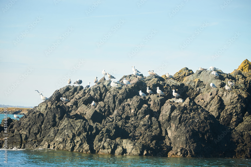 Colony of northern garnet on the rock of island in Ireland. Wild bird in the wild.