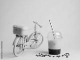 Coffee cup and orange bicycle with coffee beans against green background. Creative coffee shop delivery or takeaway concept. Delivery service banner with copy space and advertising area.