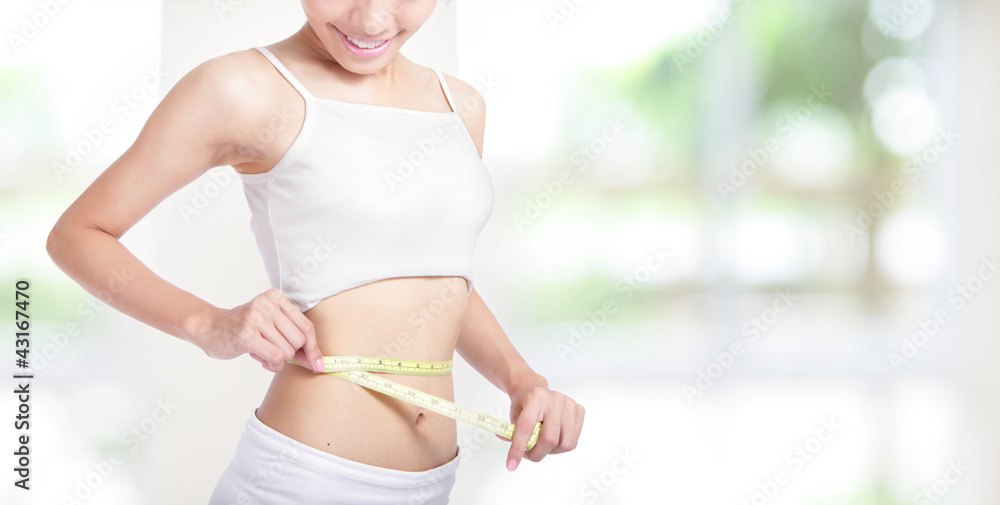 Woman smile measuring shape of waist