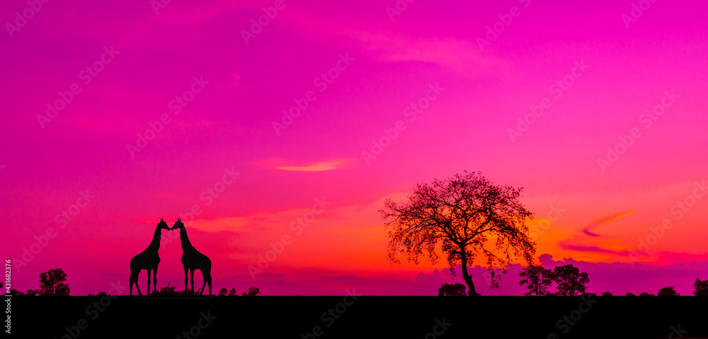 Amazing sunset and sunrise.Panorama silhouette tree in africa with sunset.Dark tree on open field dramatic sunrise.Safari theme.