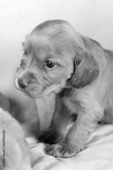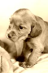 Closeup Cocker Spaniel puppy dog seating on white cloth