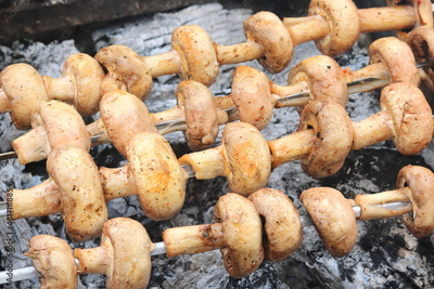 Vegetarian food made from delicious mushrooms cooked with charcoal skewers on the grill