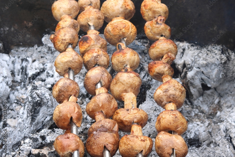 Vegetarian food made from delicious mushrooms cooked with charcoal skewers on the grill