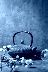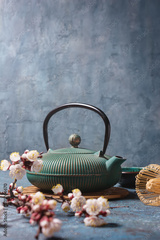 Green japanese cast iron teapot with bamboo whisk and spring blooming twigs