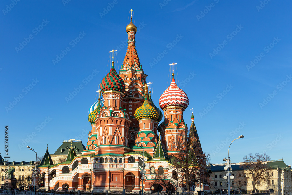 The colorful Cathedral of St. Basil the Blessed with painted domes against the blue sky. Summer sunny day. Moscow, Russia.